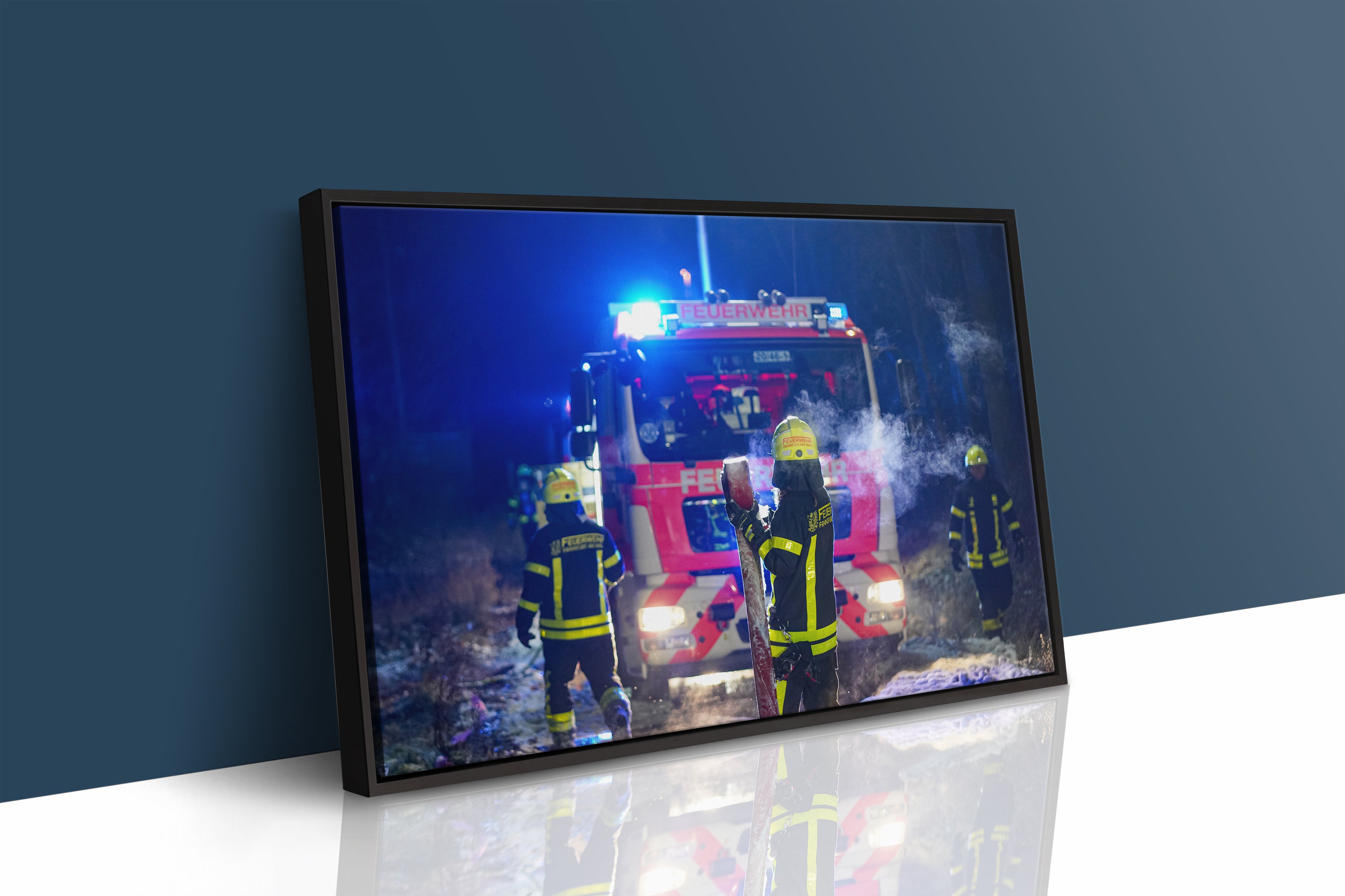 Blaulicht, Reflexstreifen und die nasse, teils verschneite Fahrbahn erzeugen ein starkes Blaulichtmotiv, das die Atmosphäre eines echten Winter-Einsatzes einfängt