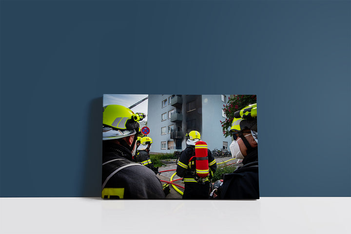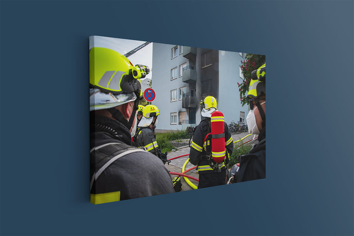 Das Motiv zeigt die Atemschutz-Notfall-Trainierten-Staffel („ANTS“) der Feuerwehr Langen bei einem Brand in einem Hochhaus in Neu-Isenburg.