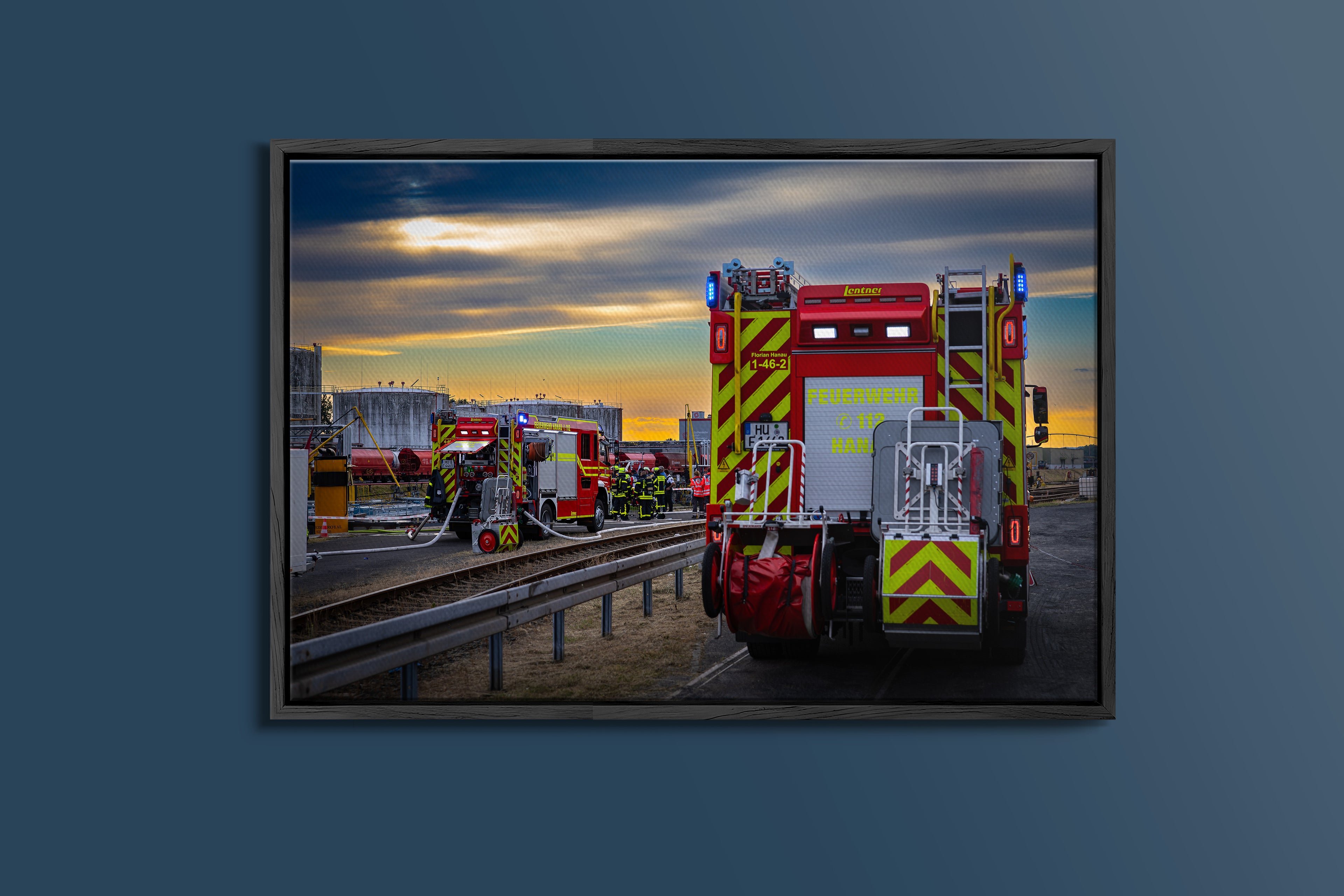 Dramatischer Feuerwehreinsatz im Abendlicht (Gerahmtes Bild)