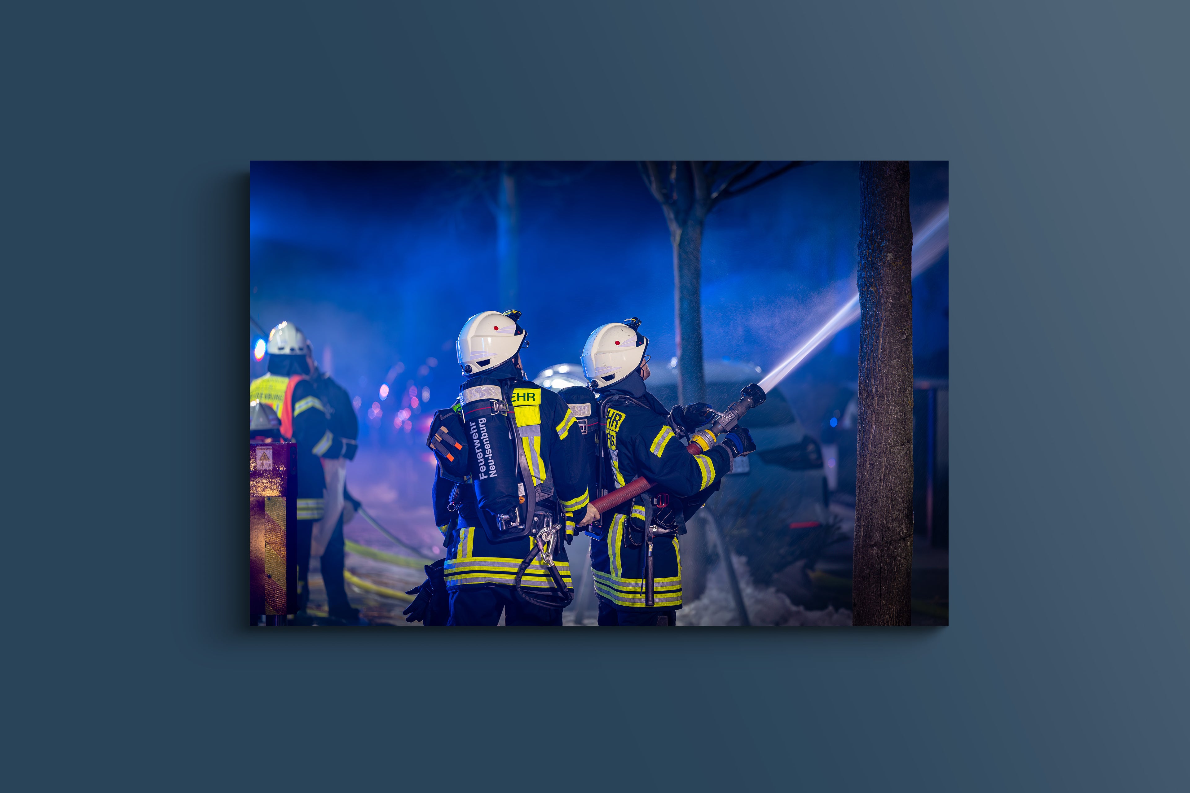 Feuerwehrkräfte kämpfen konzentriert gegen einen intensiven Wohnungsbrand in einem Mehrfamilienhaus. Die Löscharbeiten werden durch Feuerwerkskörper und Gaskartuschen in einer stark voll gestellten Messi-Wohnung erschwert. Moderne Technik wie Drehleitern und mehrere Rohre werden von außen eingesetzt; blaues Licht, Rauch und das engagierte Handeln der Feuerwehr prägen das Bild. Trotz entschlossener Maßnahmen wird eine Person in der Wohnung tödlich verletzt, die Nachlöscharbeiten dauern lange an.