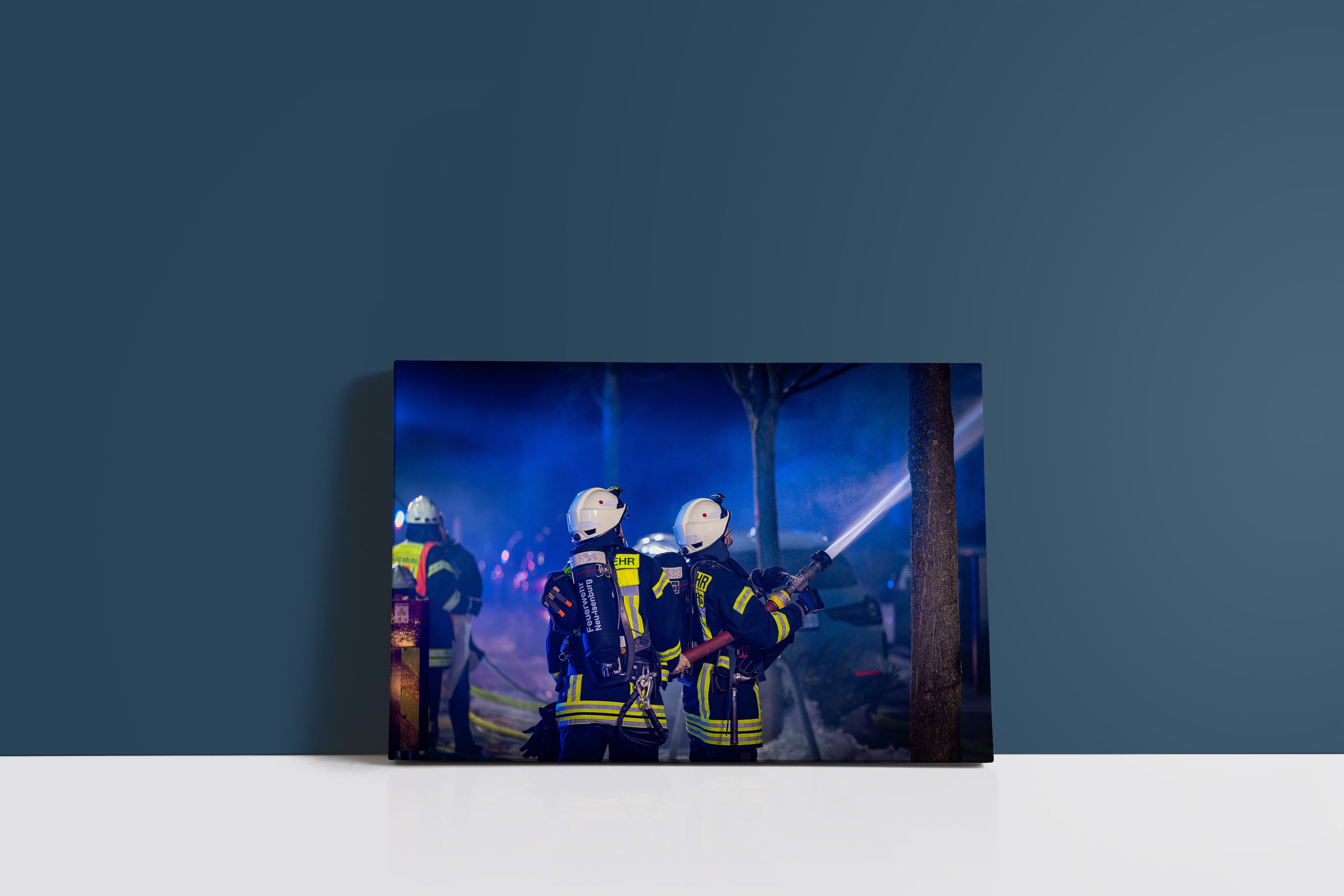 Feuerwehr bekämpft Wohnungsbrand mit Drehleiter (Leinwand)