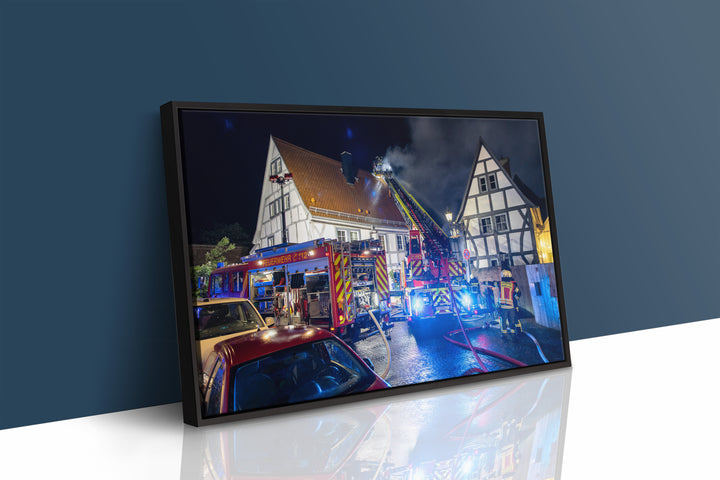 Feuerwehr-Einsatz bei Nacht Dachstuhlbrand Altstadt Seligenstadt (Gerahmtes Bild)