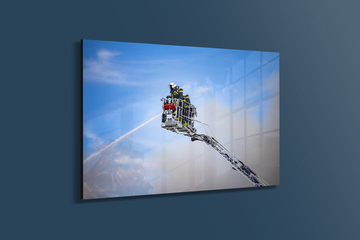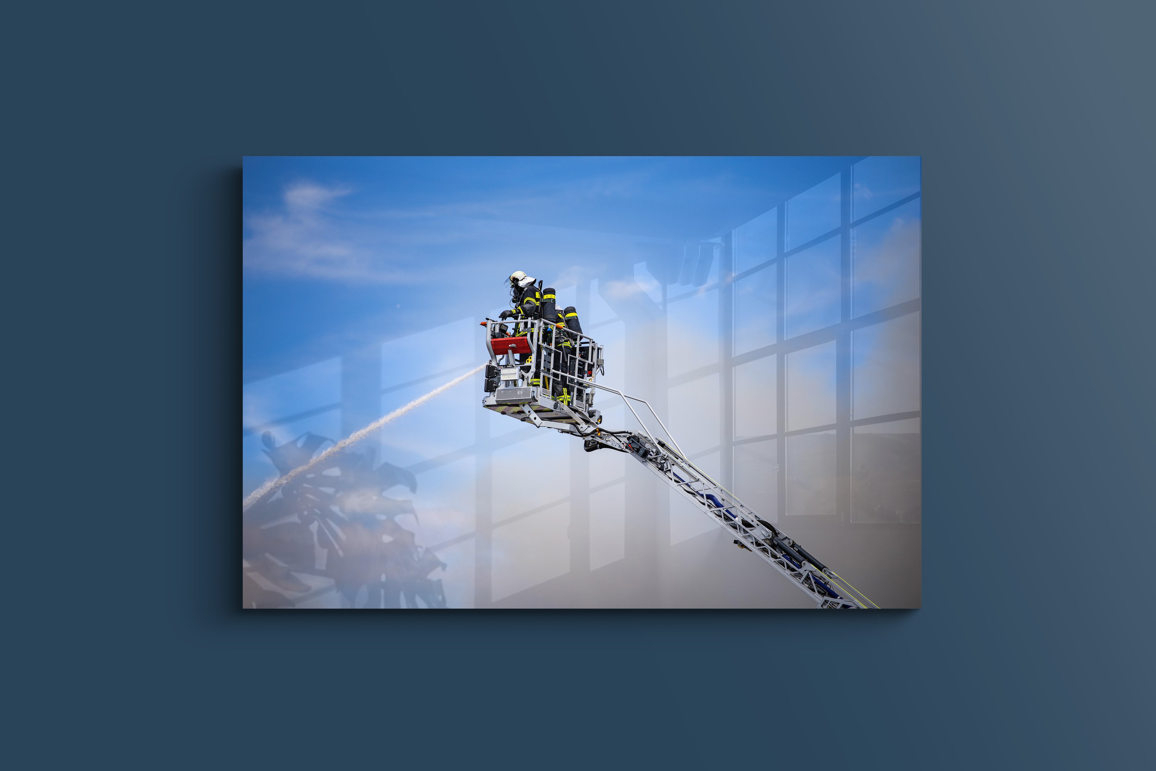 Feuerwehrleute kämpfen in schwindelerregender Höhe aus dem Korb einer Drehleiter gegen die Flammen einer Maschinenhalle. Im Hintergrund zeichnen Rauch und Himmel ein dramatisches Bild vom Großeinsatz in Dietzenbach. Schutzanzüge und Wasserstrahl verdeutlichen den entschlossenen Einsatz gegen Hitze und Einsturzgefahr.
