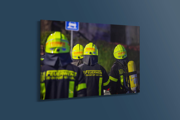 Feuerwehr Frankfurt im nächtlichen Einsatz: Die Einsatzkräfte rücken gemeinsam im markanten Schutzanzug vor, ihre Helme leuchten im Schein des Blaulichts. Nach einem Brand im Außenbereich eines Restaurants werden die Bewohner eines Wohnhauses in Sicherheit gebracht. Mit konzentrierter Teamarbeit und moderner Ausrüstung steht der Schutz der Menschen stets im Mittelpunkt.