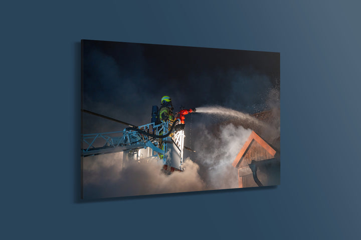 Mitten in der Nacht kämpfen Feuerwehrkräfte in Schriesheim gegen einen ausgedehnten Gebäudebrand. Dichter Rauch hüllt das Haus ein, während der Löschangriff von der Drehleiter aus das Flammenmeer durchbricht. Die feuchte Luft und die spiegelnden Lichtstrahlen zeigen, wie anspruchsvoll der Einsatz für die Helfer ist – Entschlossenheit und Würde prägen das Bild.