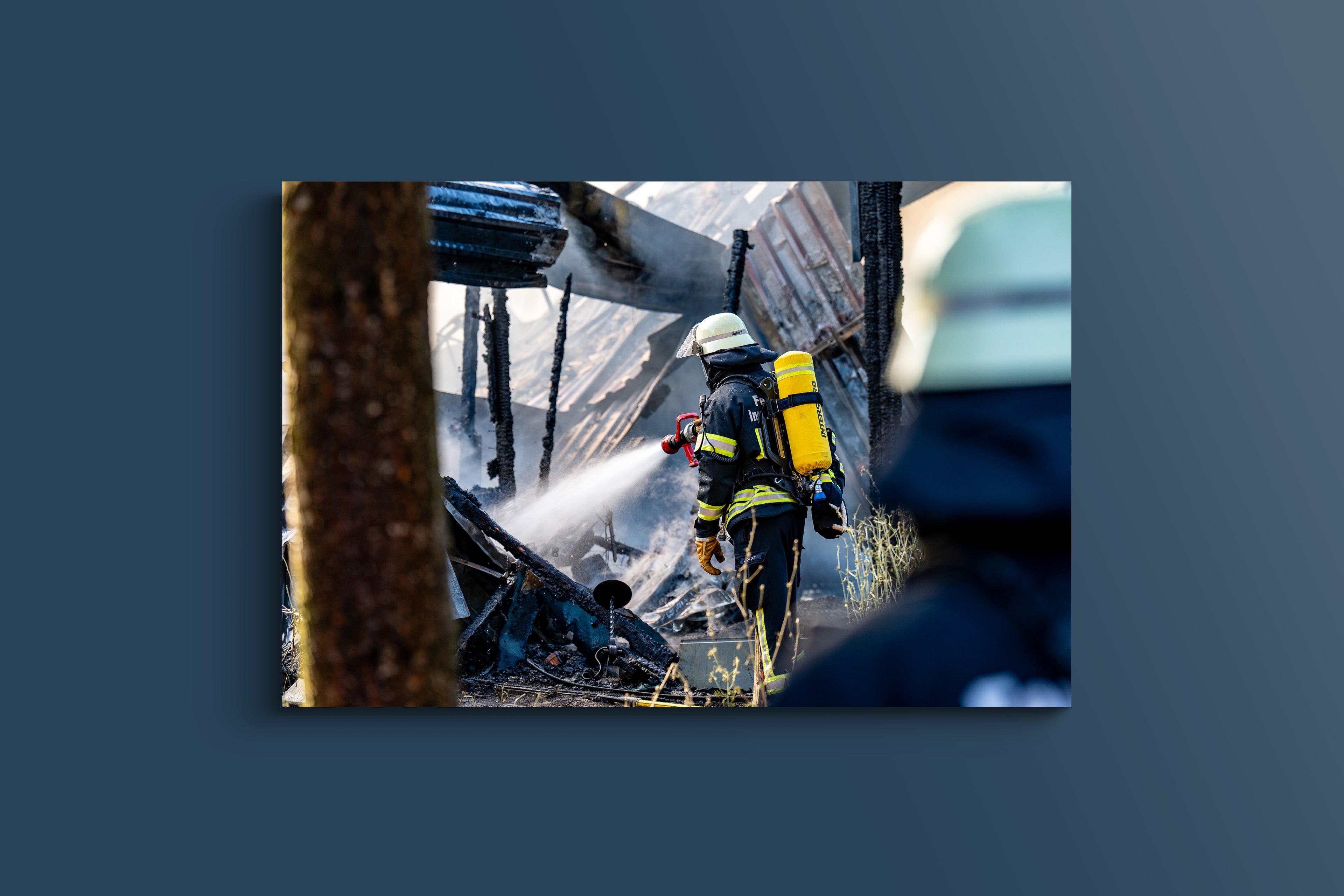 Mitten in Heidesheim kämpft ein Feuerwehrmann am frühen Morgen gegen die Flammen eines niedergebrannten Hofs. Im Rauch und zwischen verkohlten Trümmern setzt er mit Atemschutz und Wasserstrahl ein starkes Zeichen für Einsatz und Rettung – Tiere konnten rechtzeitig geborgen werden, Menschen blieben unverletzt. Die Szene wirkt angespannt und würdevoll.