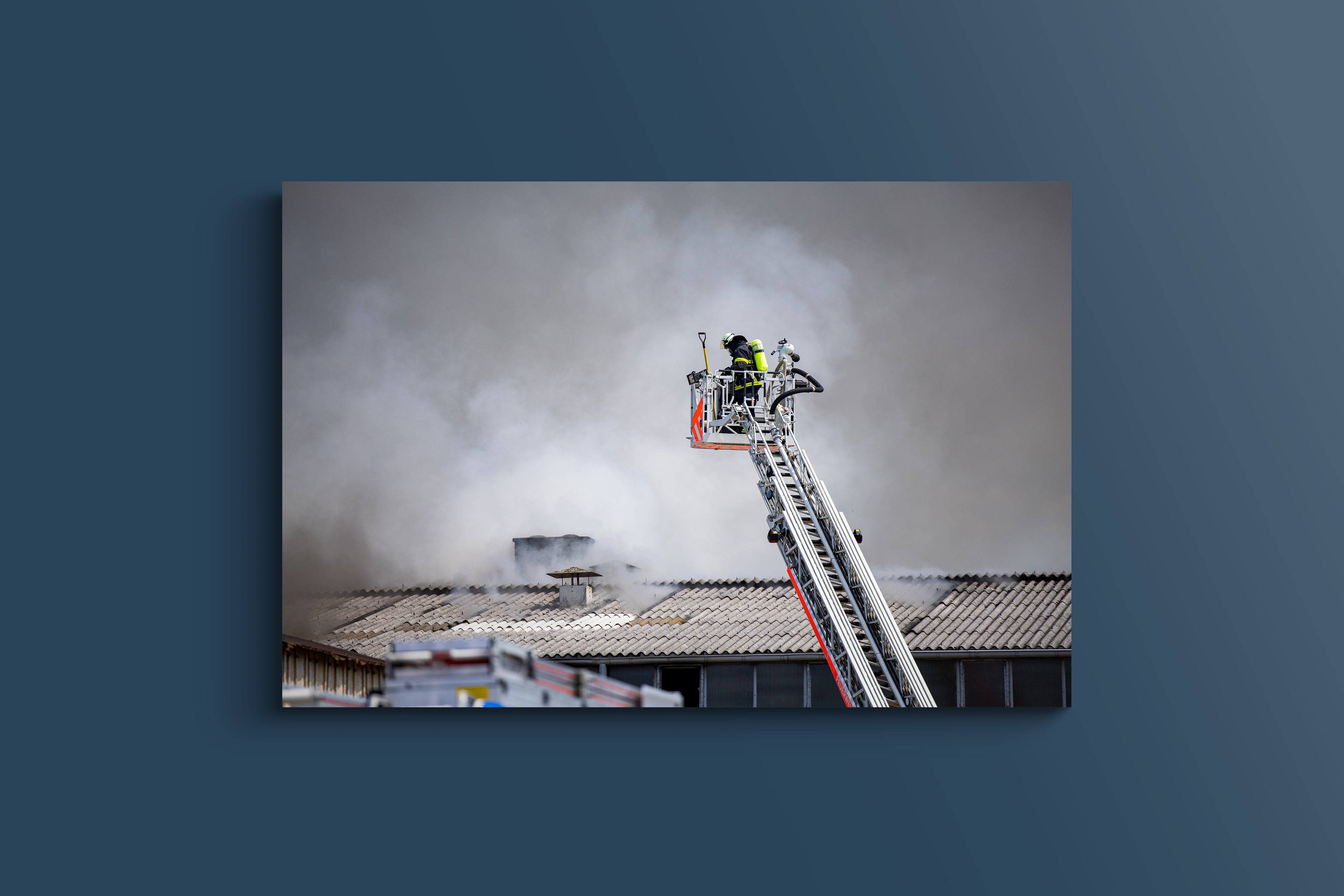 Zwei Feuerwehrleute arbeiten auf der Drehleiter über dem Dach einer Maschinenhalle, während dichter Rauch das Gebäude umhüllt. Die Szene wirkt angespannt und zeigt die entschlossene Einsatzkraft der Feuerwehr im Kampf gegen den Brand. Atemschutz und Ausrüstung treten im grellen Licht klar hervor; im Hintergrund zeichnen die Rauchschwaden die bedrohliche Lage. Dietzenbach, Industriegebiet — würdevoll und eindringlich.
