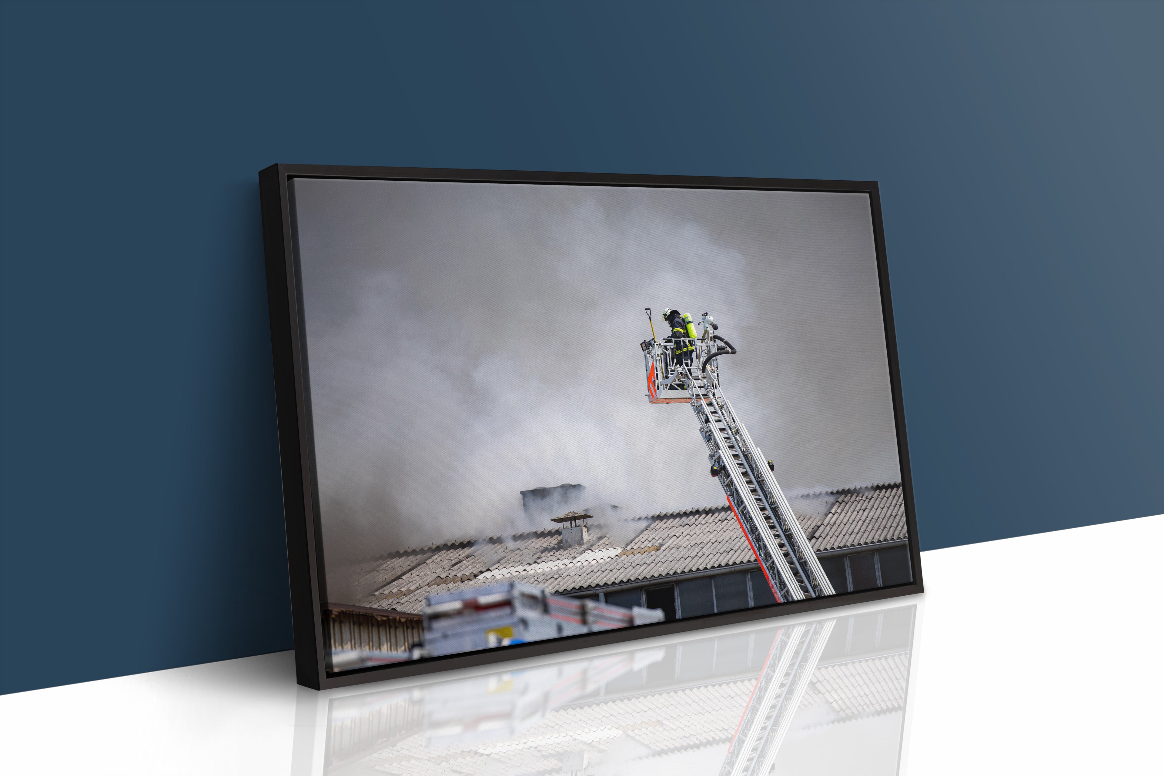 Feuerwehreinsatz auf Drehleiter – Maschinenhalle Dietzenbach (Gerahmtes Bild)