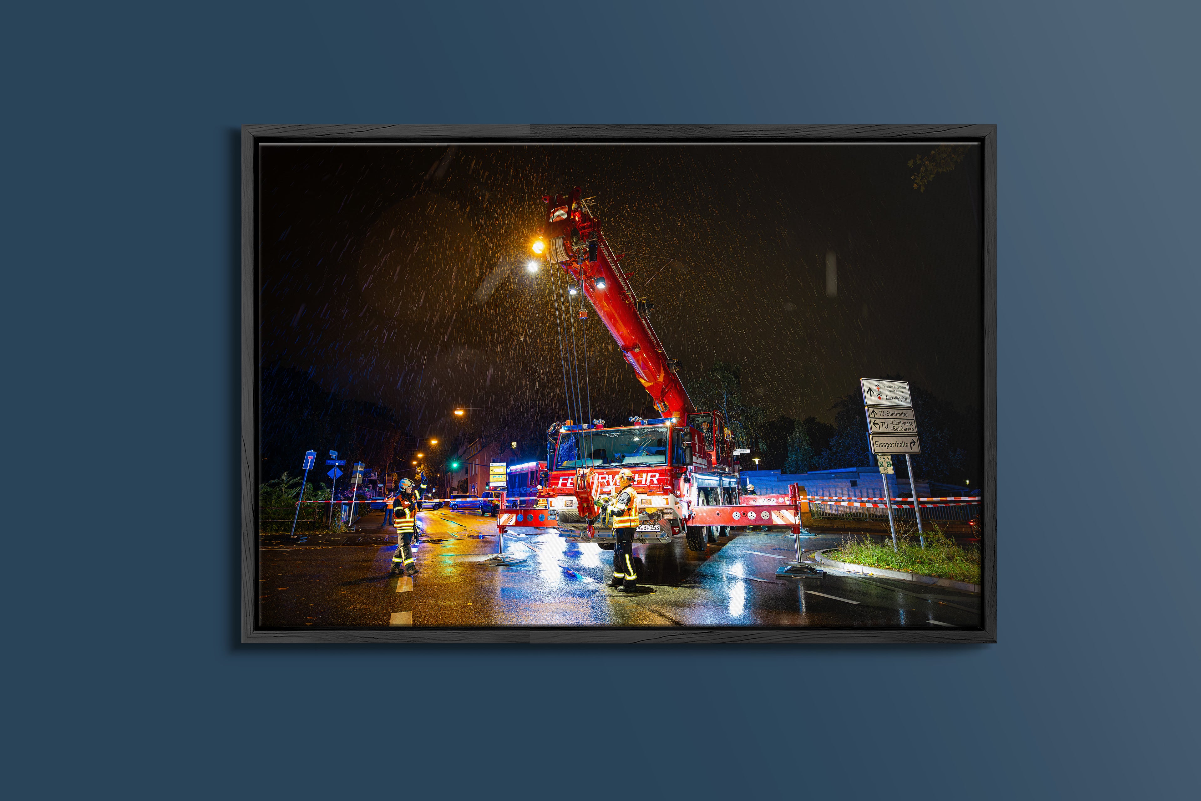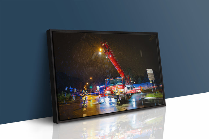 Feuerwehrkran-Nachteinsatz bei Brückenunfall (Gerahmtes Bild)