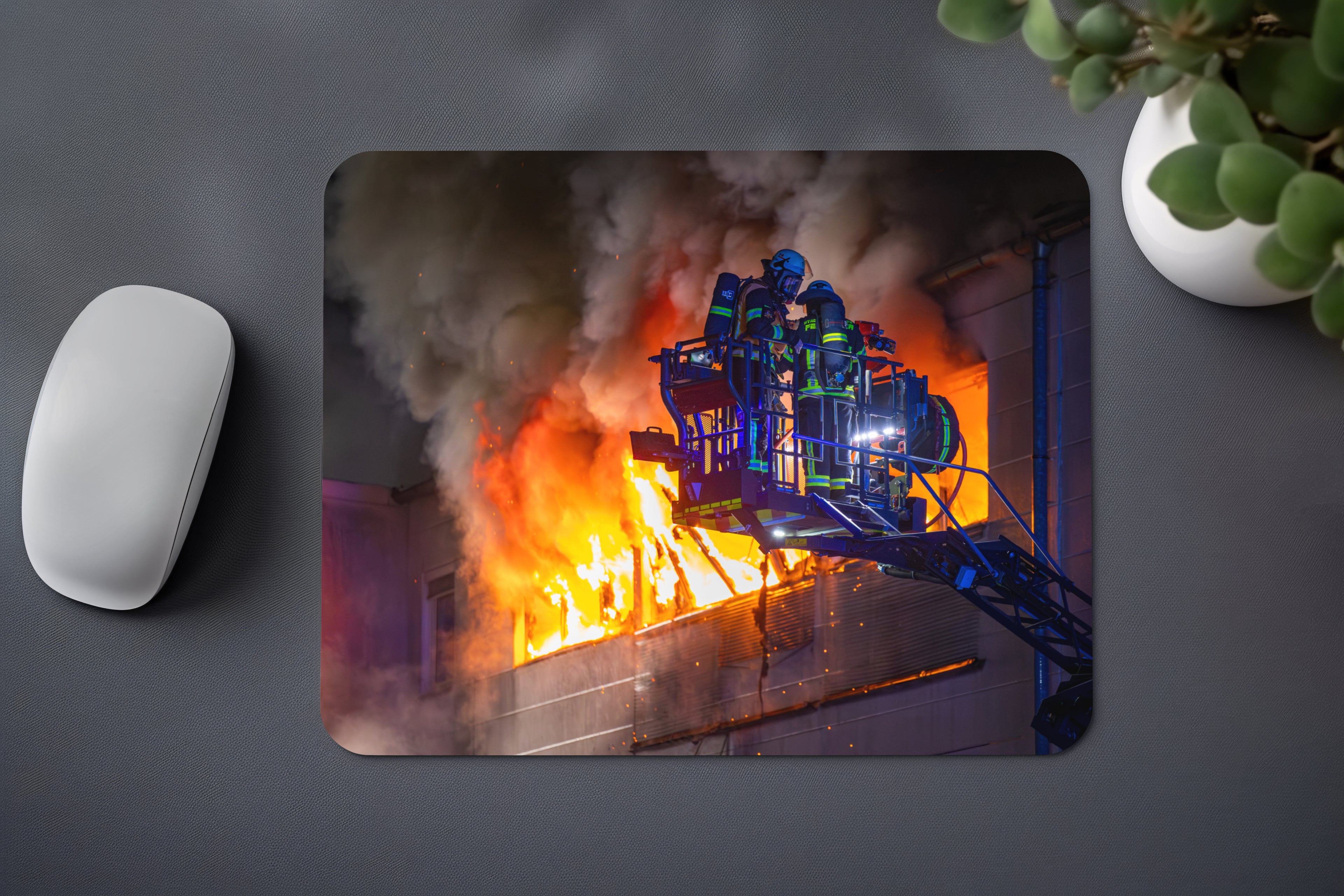 Dieses Mauspad zeigt einen dramatischen nächtlichen Feuerwehreinsatz und bringt echte Einsatzatmosphäre direkt auf deinen Schreibtisch. Das Motiv mit lodernden Flammen und Feuerwehrkräften auf der Drehleiter ist ein echter Blickfang für Feuerwehrfans, Einsatzkräfte und alle, die Blaulichtmomente lieben.