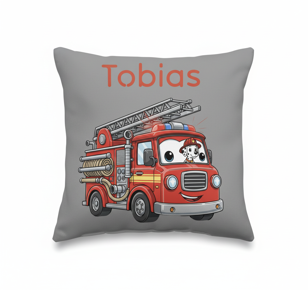 Dieses Premium-Kissen mit dem fröhlichen Feuerwehrwagen und seinem Dackel-Freund wird individuell mit jedem Wunsch-Namen (z. B. Tobias, Max oder Anna) beschriftet – perfekt personalisiert für dein Kind. Ideal als Weihnachtsgeschenk oder Belohnung – hochwertig, sicher und super weich für traumlosen Schlaf.