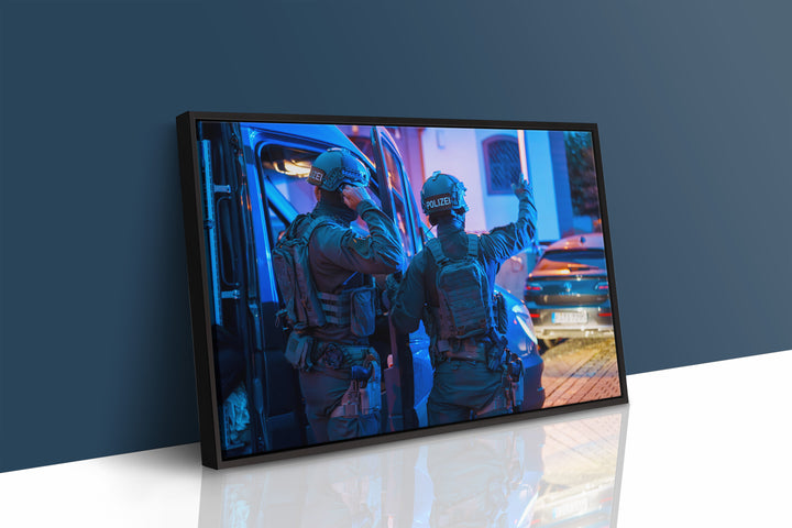 SEK-Einsatz Polizei im abendlichen Viertel (Gerahmtes Bild)
