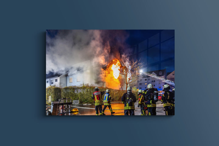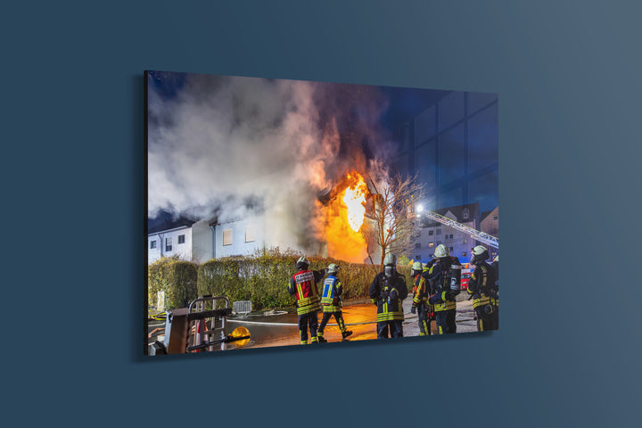 Wohnhausbrand Feuerwehr bekämpft nächtliche Flammen (Alu-Dibond)